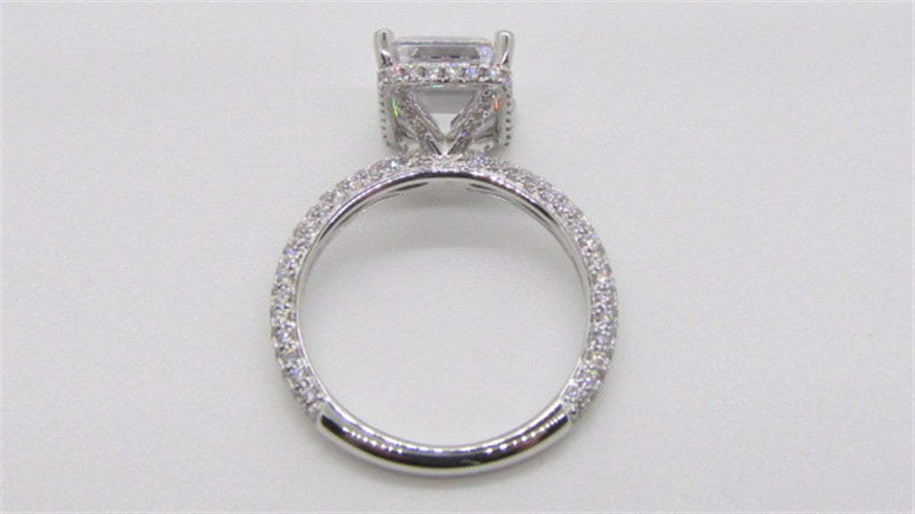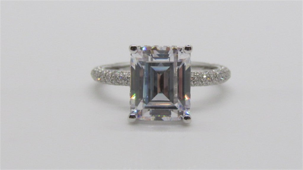 18KW DIAMOND ENGAGEMENT RING WITH ONE EMERALD CUT CUBIC ZIRCONIUM IN CENTER MEASURING: 10 x 8mm AND 136 ROUND DIAMONDS ON SHANK, UNDERHALO, AND GALLERY = 0.75CTTW VS F/G