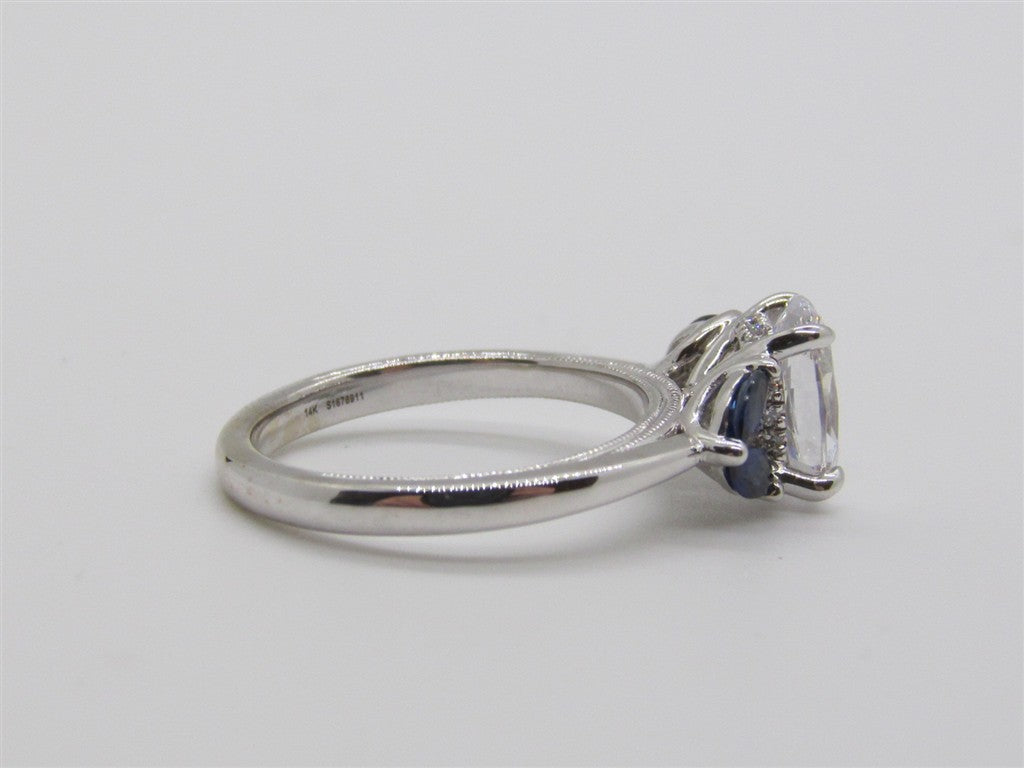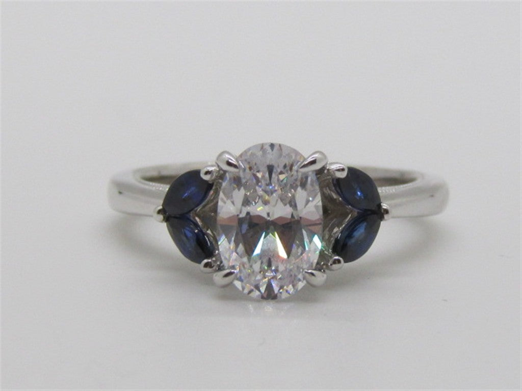 14KW DIAMOND ENGAGEMENT RING WITH ONE OVAL CZ IN CENTER MEASURING: 9X6MM, FOUR MARQUISE SAPPHIRES ON SIDES OF CENTER = .41CTTW A QUALITY, AND 12 ROUND DIAMONDS IN UNDERHALO = .06CTTW SI G/H