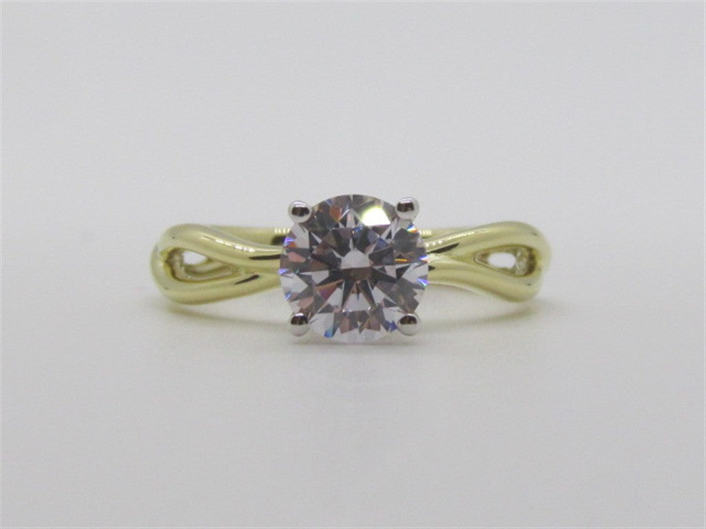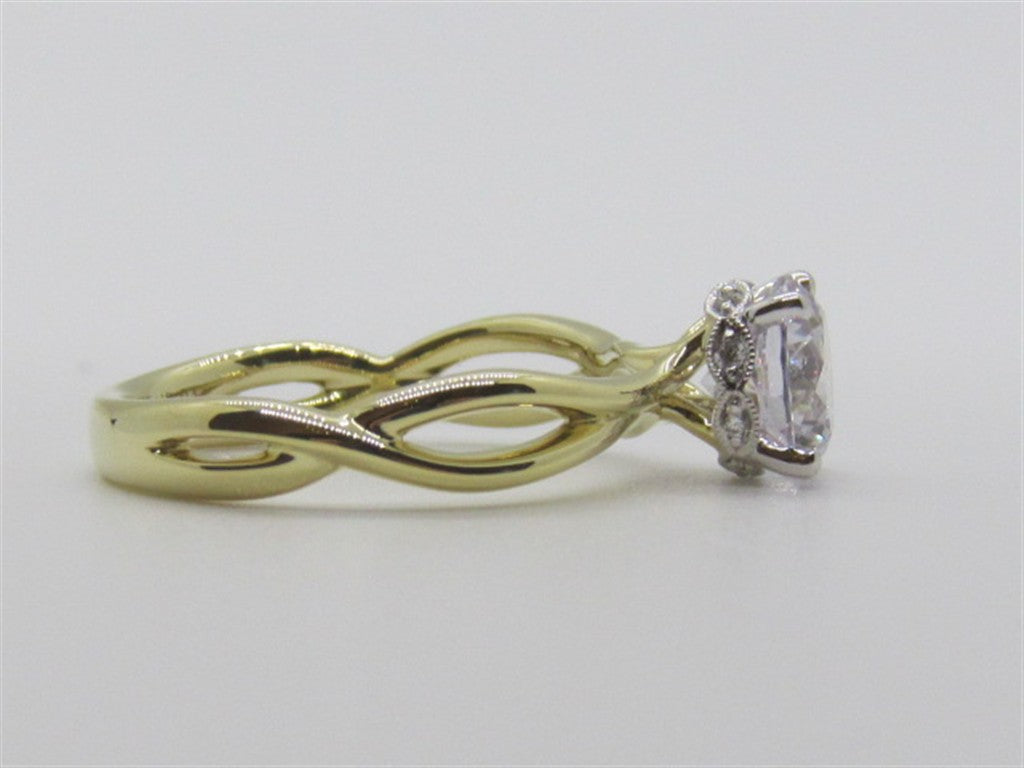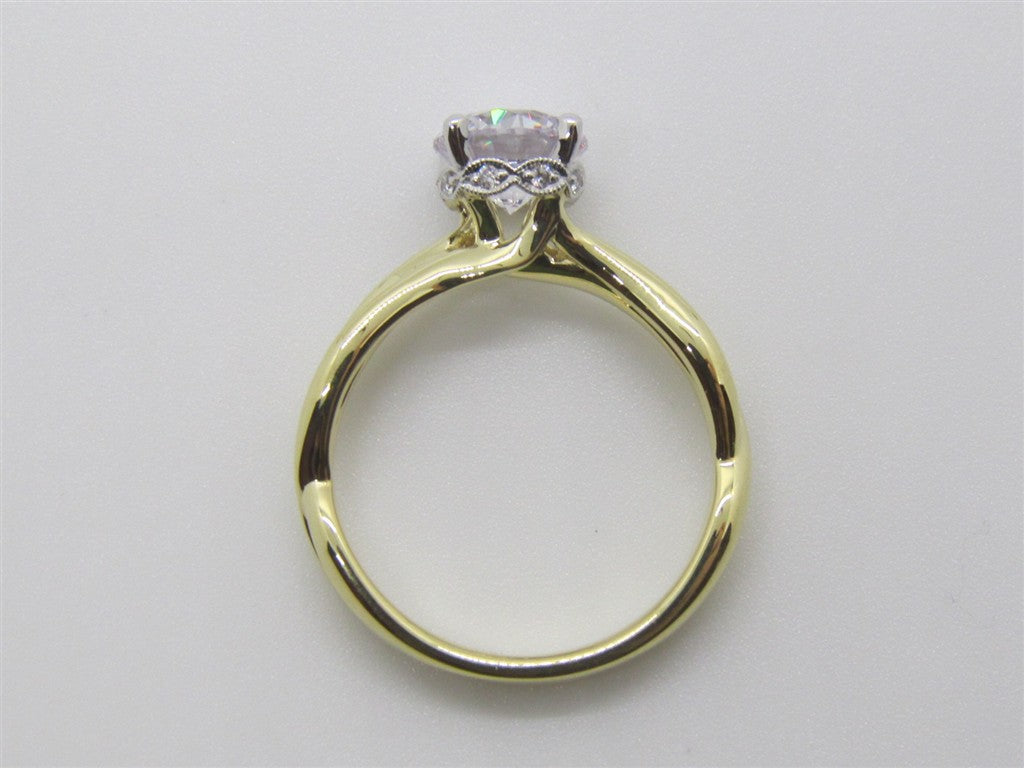 18KTT DIAMOND TWIST SHANK ENGAGEMENT RING WITH UNDERHALO WITH ONE ROUND CZ MEASURING: 7MM AND EIGHT ROUND BRILLIANT CUT DIAMONDS = 0.04CTTW VS F/G