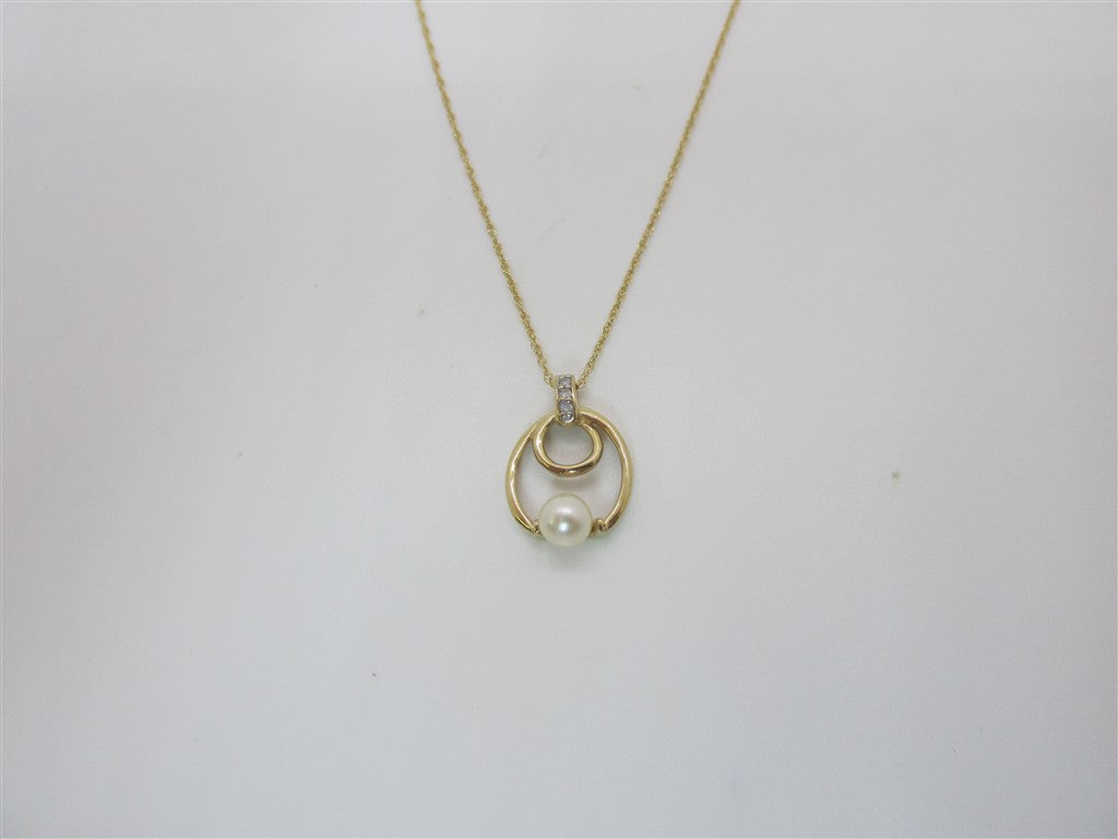 10KY PEARL AND DIAMOND OPEN PENDANT ON A 14KY 18" .8G CABLE CHAIN CONSISTING OF ONE 5.5MM A QUAL CREAM PEARL AND THREE RFC DIA ON BAIL MEASURING APPROX 1.3MM WEIGHING APPROX .05CTTW PROMO QUAL H-I