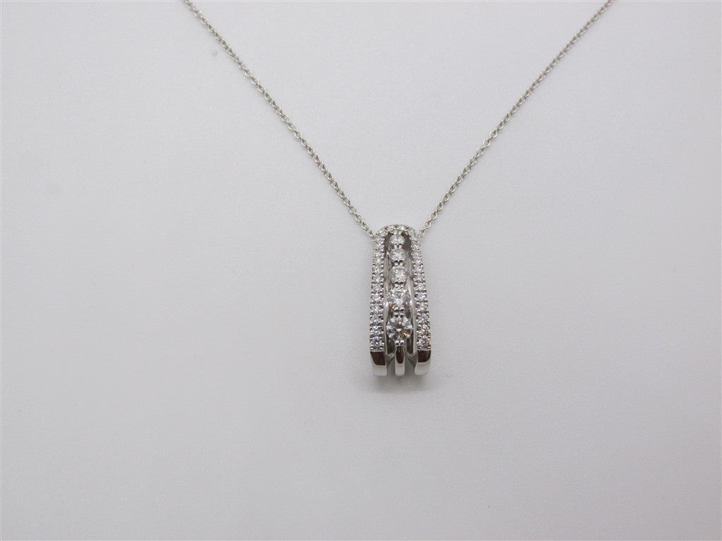 18KW DIAMOND PENDANT WITH SMALL ROUND DIAMONDS ON OUTER ROWS AND LARGE ROUND DIAMONDS IN CENTER 33RD DIAS = .60CTTW VS2 F/G ON AN 18" CABLE CHAIN SERIAL: 734083 MP1795 SIMON G