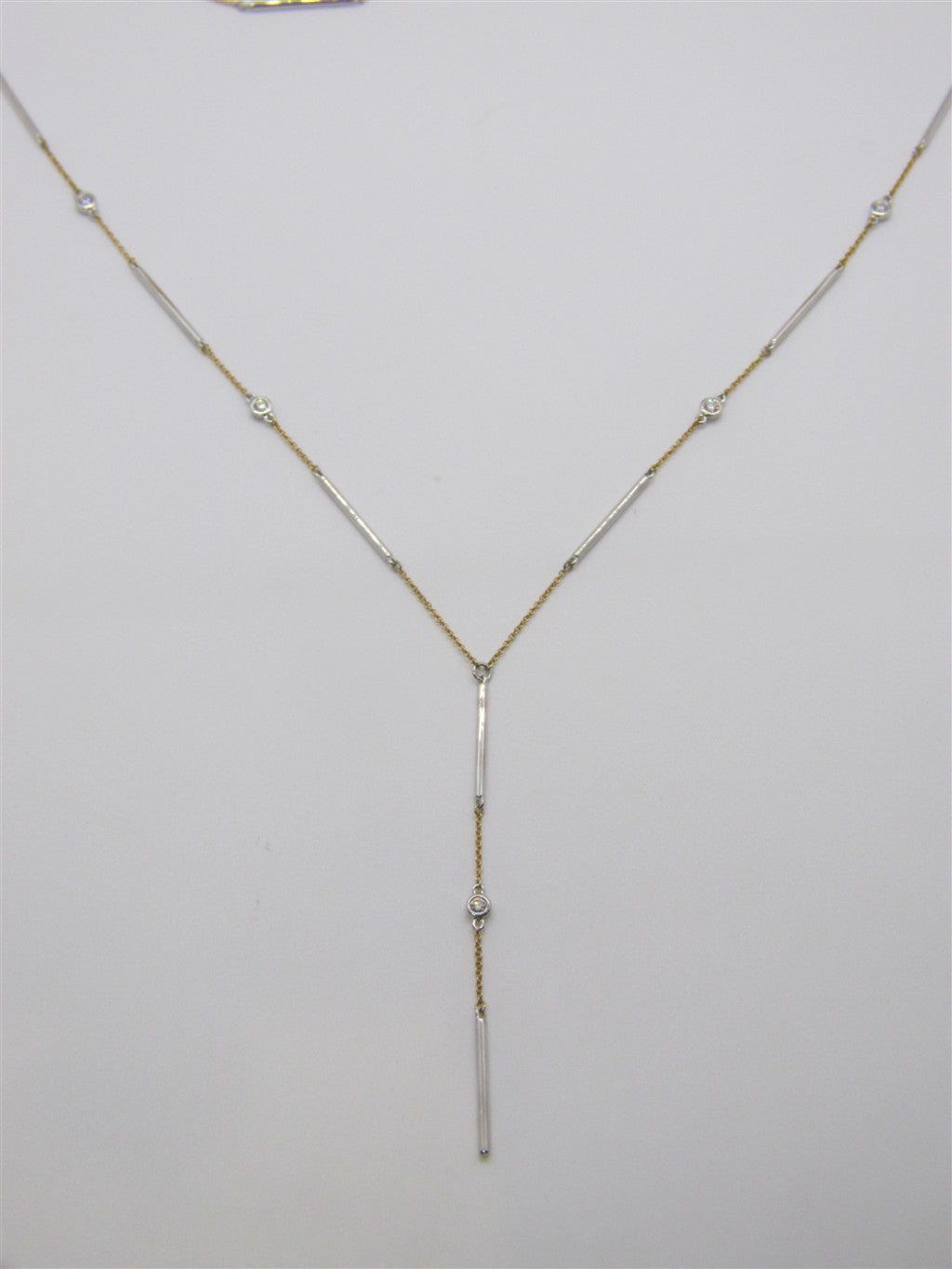 18K TWO TONE LARIAT WITH DIAMOND STATIONS AND HIGH POLISHED BAR STATIONS WITH FIVE ROUND BRILLIANT CUT DIAMONDS = 0.23CTTW VS F/G