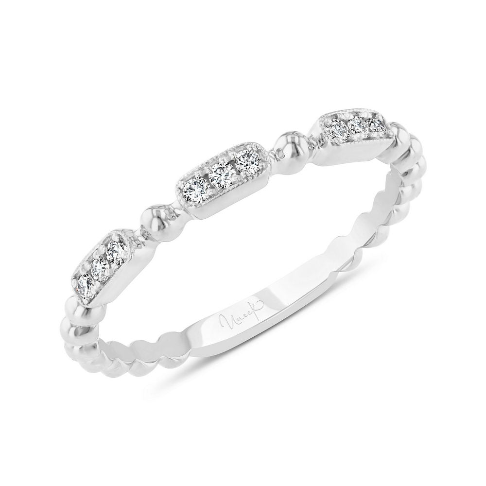 The it-girl bride is sure to love the statement details in this wedding band; the gorgeous textures and playful geometry in the bands give off a kind of glamour that is at turns daring and edgy; milgrain-lined bars of diamonds are interspersed with high polish beads, and the bead motif extends to the bottom; from Uneek's Us Collection.