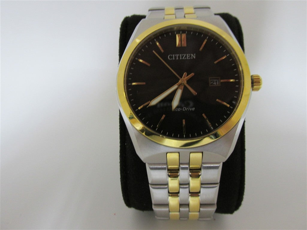 MENS CITIZEN ECO DRIVE WATCH WITH TWO TONE STAINLESS STEEL BRAC AND BLACK FACE WR100