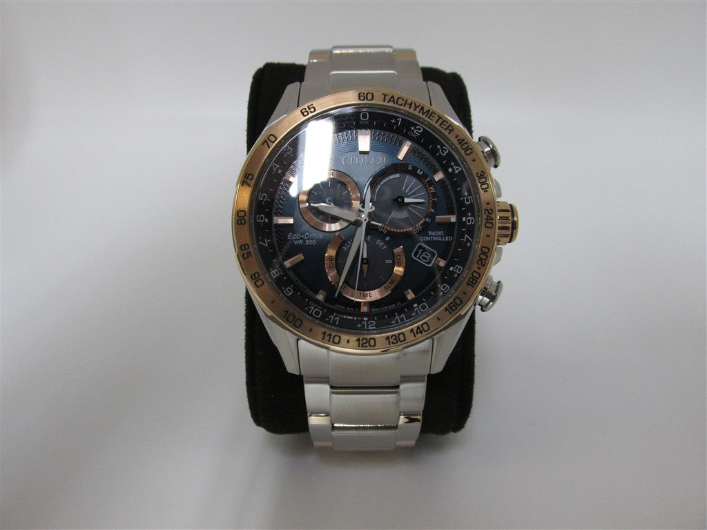 MENS CITIZEN ECO DRIVE WATCH WITH STAINLESS STEEL BRAC AND ROSE TONE ACCENTS WITH BLUE DIAL WR200