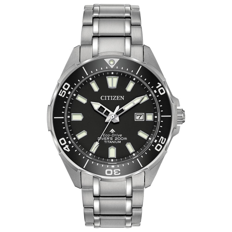 Proof that a dive watch can be fun & functional with the CITIZEN ISO-compliant Super Titanium Promaster Diver. With Eco-Drive technology, it is powered by light and never needs a battery, so you'll never need to open your caseback or compromise your dive again. Featured in a Super Titanium™ case and bracelet, aluminum bezel and black dial, one-way rotating elapsed time and WR200. Featuring our Eco-Drive technology – powered by light, any light. Never needs a battery. Caliber number E168.