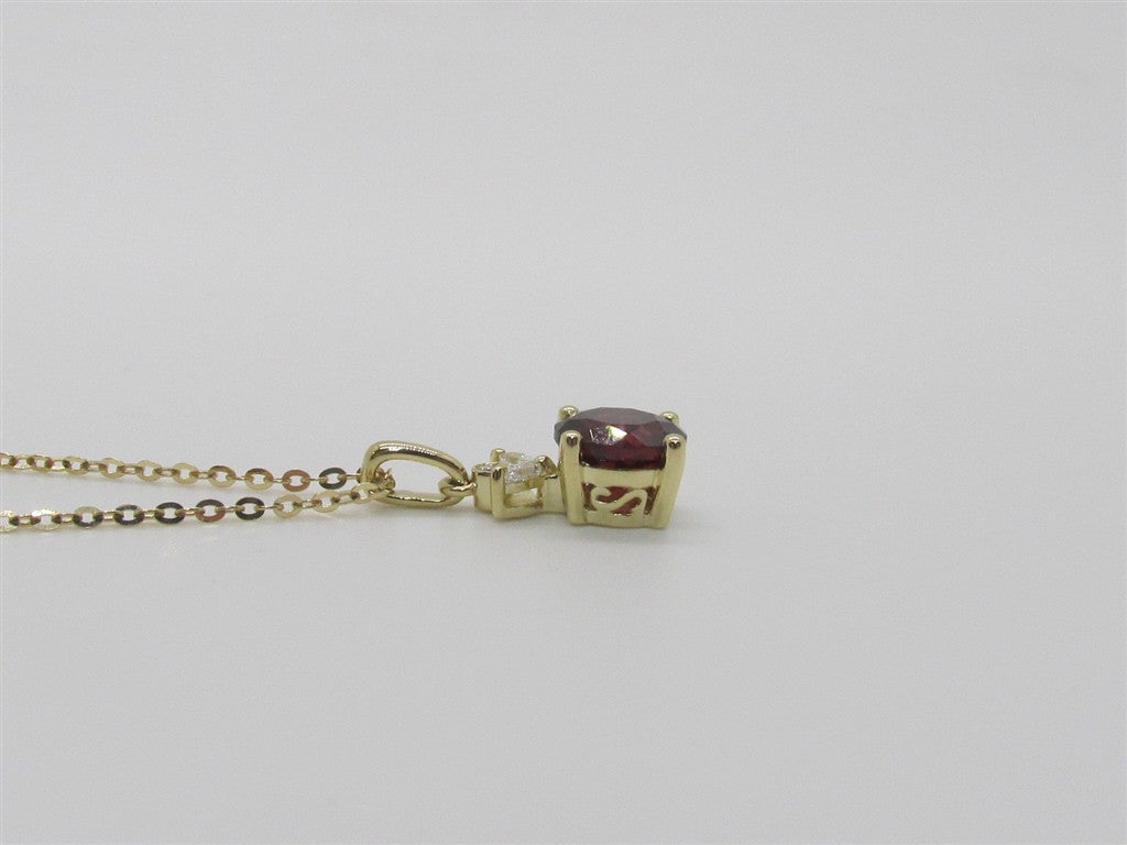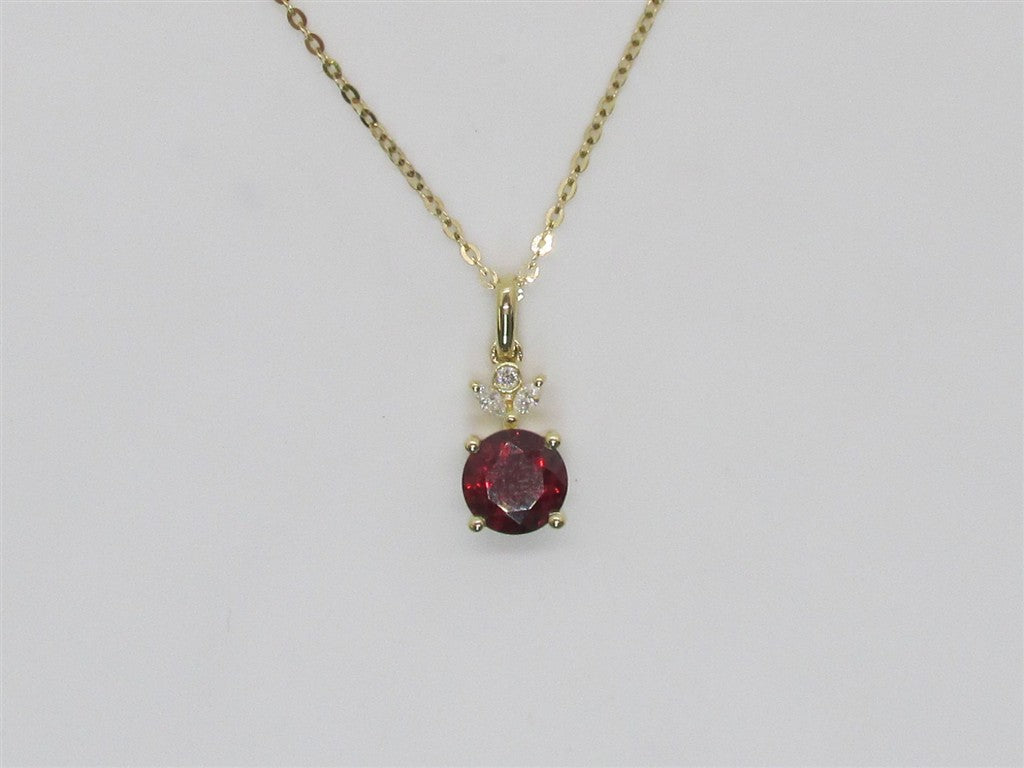 14KY GARNET AND DIAMOND PENDANT CONSISTING OF ONE ROUND FACETED GARNET MEASURING APPROX 7MM AND ONE ROUND BRILLIANT CUT DIAMOND WEIGHING APPROX .02CT AND TWO MARQUISE BRILLIANT CUT DIAMONDS WEIGHING APPROX .09TW